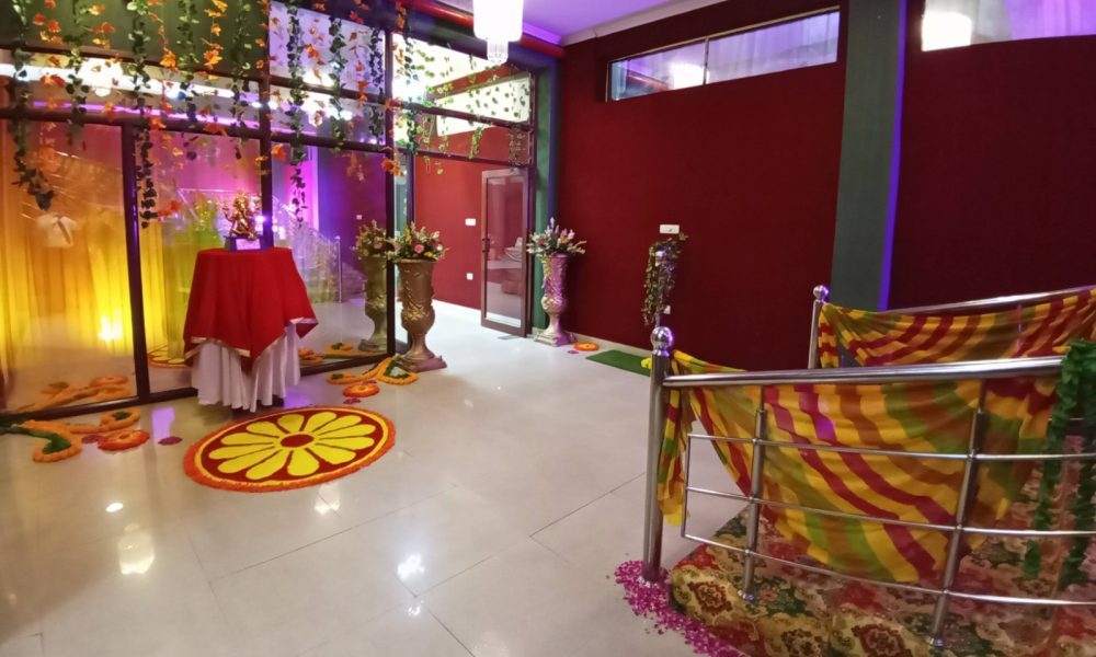 Step into the captivating ambience of Our Sattvik Hall, beautifully designed with texture of copper and mirrors, where elegance seamlessly intertwines with tranquility. The simplicity and soberness of our space, defines a unique charm. Our spacious venue accommodates up to 150 guests, accompanied by an expansive open lawn party area for gatherings of 500. Immerse yourself in the delightful flavors of our freshly prepared sattvik cuisine, skillfully crafted without onion and garlic. Experience the culinary artistry with live counters, offering mouthwatering dishes. Indulge in the irresistible allure of our in-house prepared chats, ensuring every bite is a burst of delightful flavors. Welcome to a world where every detail is crafted to elevate your event experience.